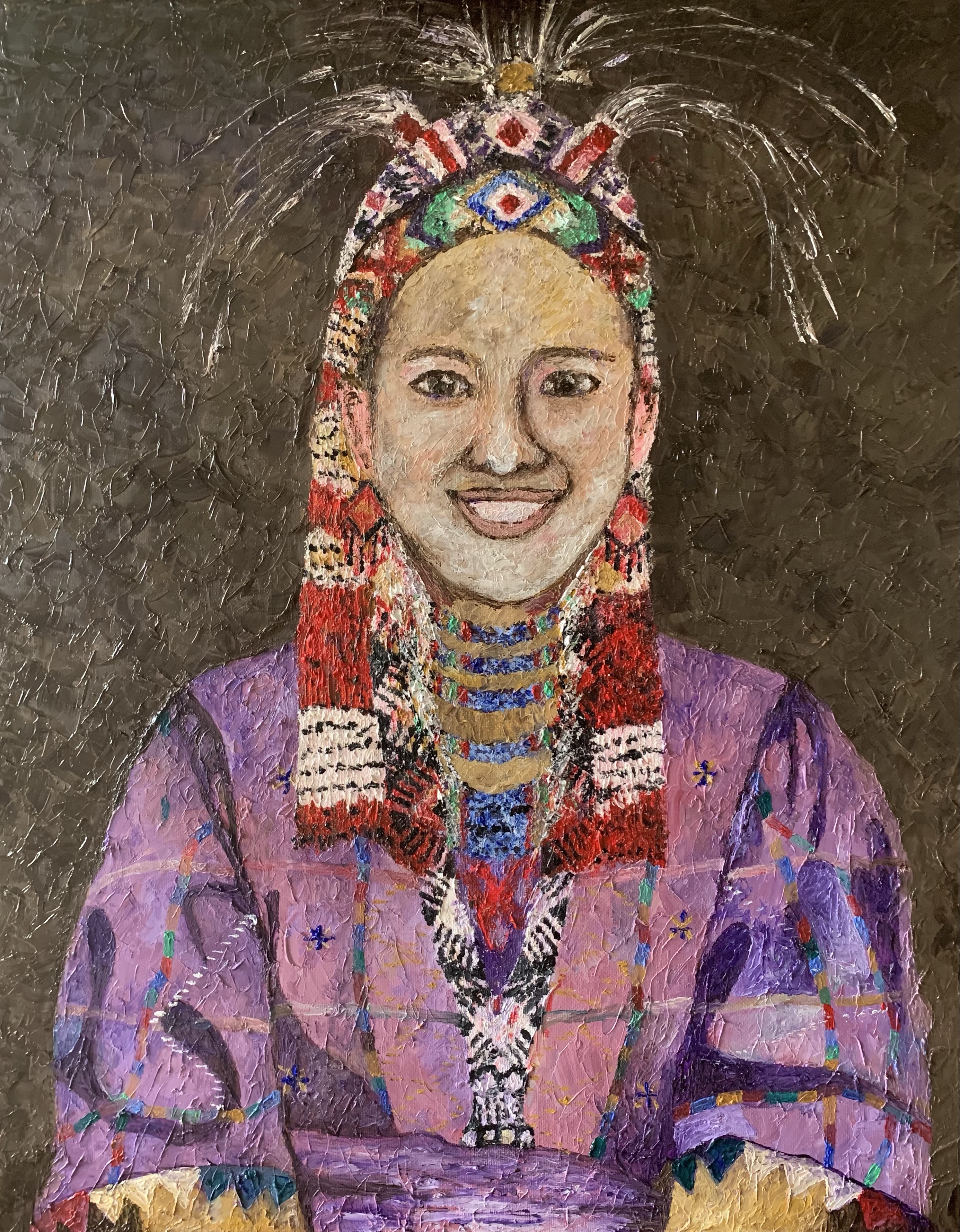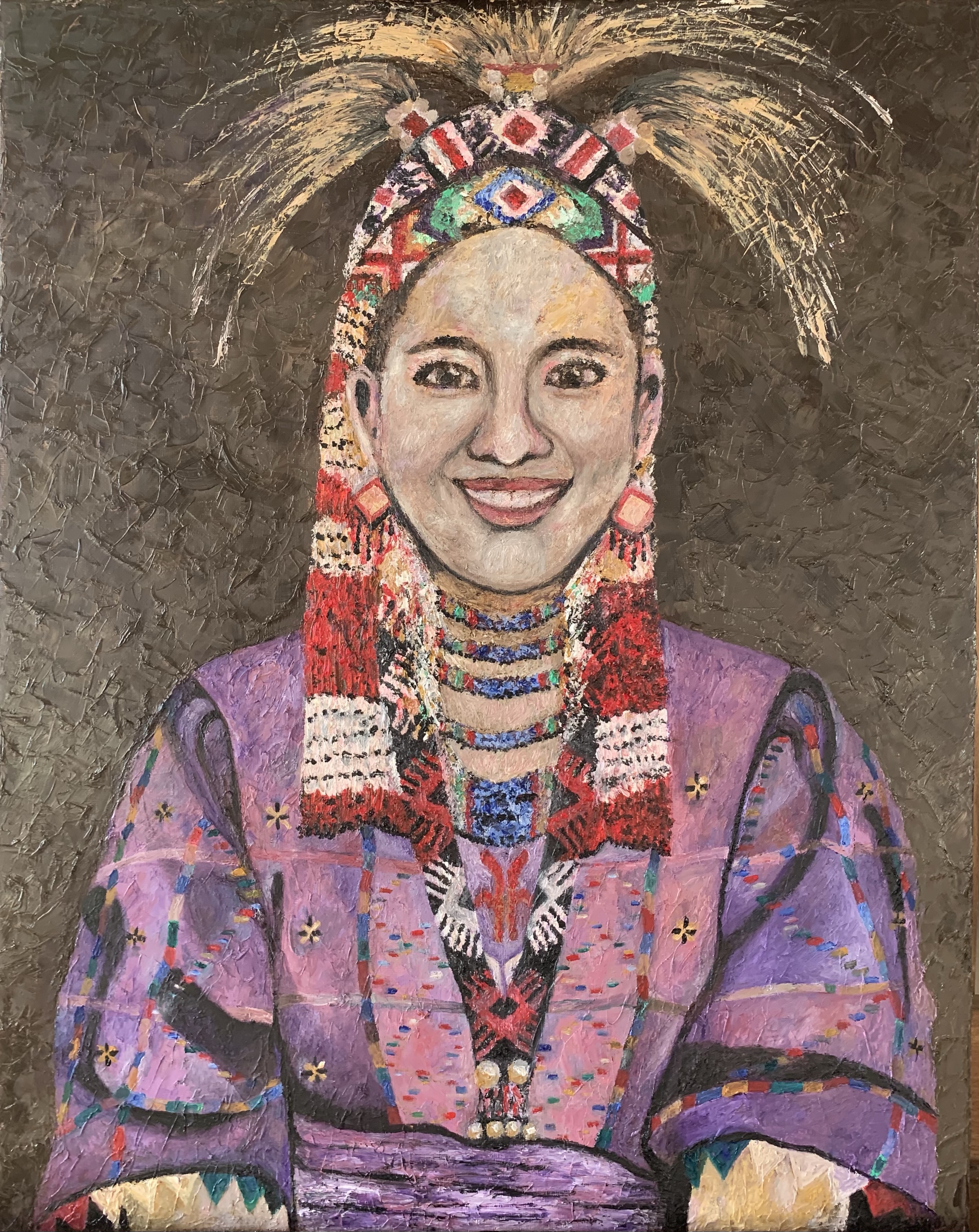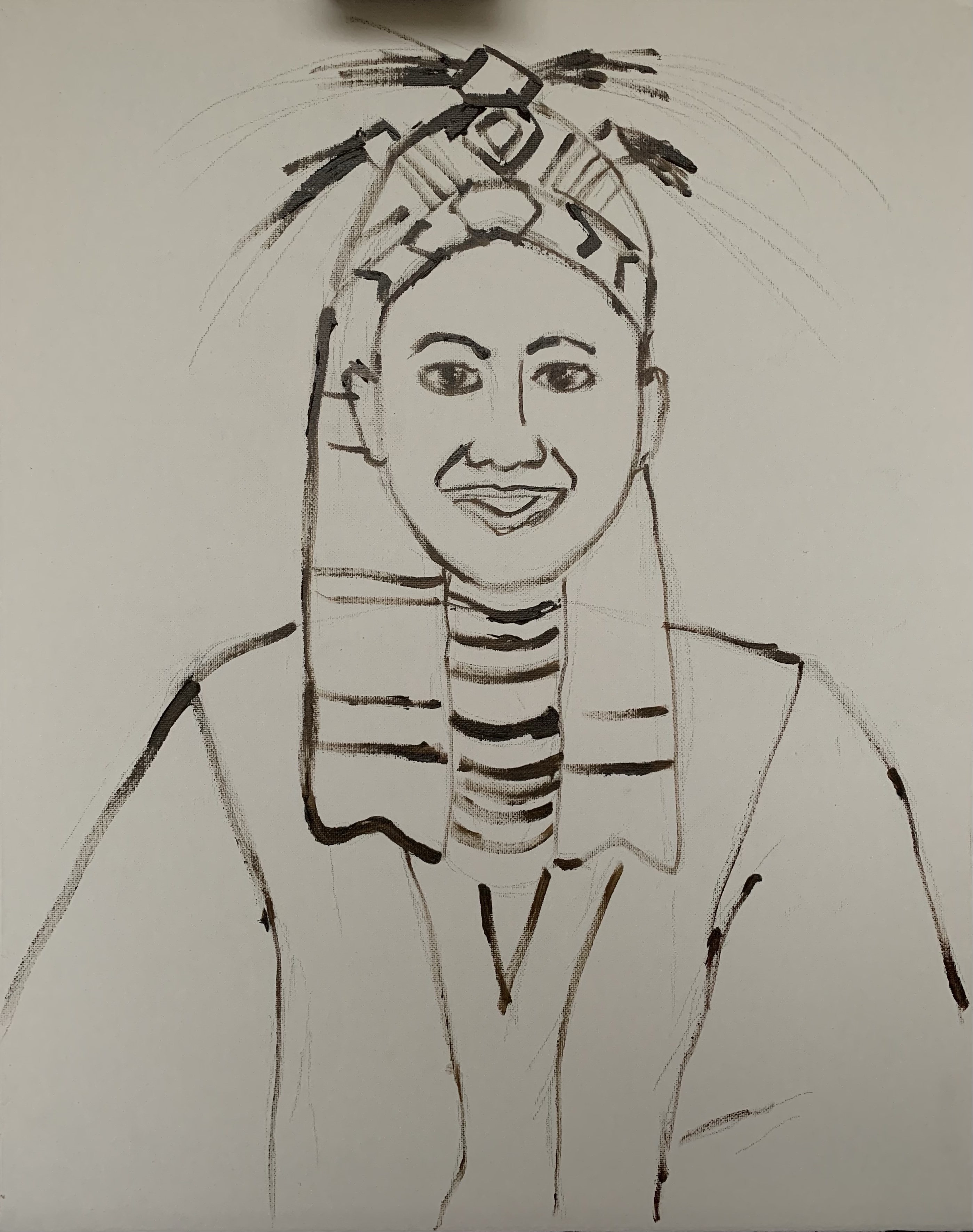 | This is the reference, cropped from a much larger photograph so resolution is very low. Details of the dress and headdress are available from other photographs. | The line drawing establishes the main shapes. The portrait is divided horizontally into thirds: face, chest, and lower part of the sleeves. I send Lei a photo to tell her that I’m starting the portrait. | The outlines are redrawn using raw umber. There is no attempt at likeness. The goal is to make sure the shapes are intact and ready for the next phase. |