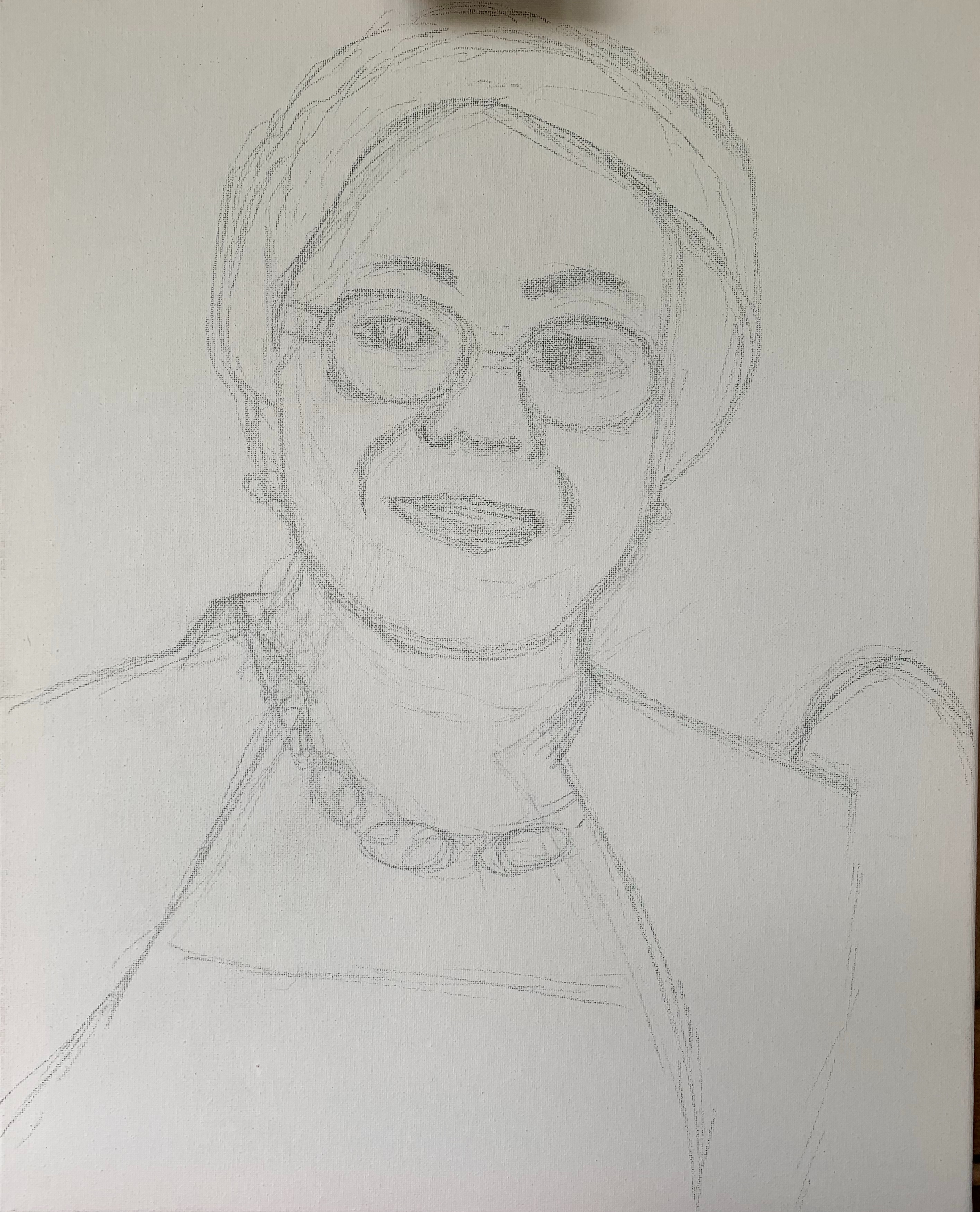| This is the reference photograph, heavily cropped, low resolution, but it was her favorite from all the photos we went through. | The line drawing establishes the main shapes. The portrait has two parts: the face and the dress. | The outlines are redrawn with burnt umber. The goal is to make sure the shapes are intact and ready for the next phase. |
