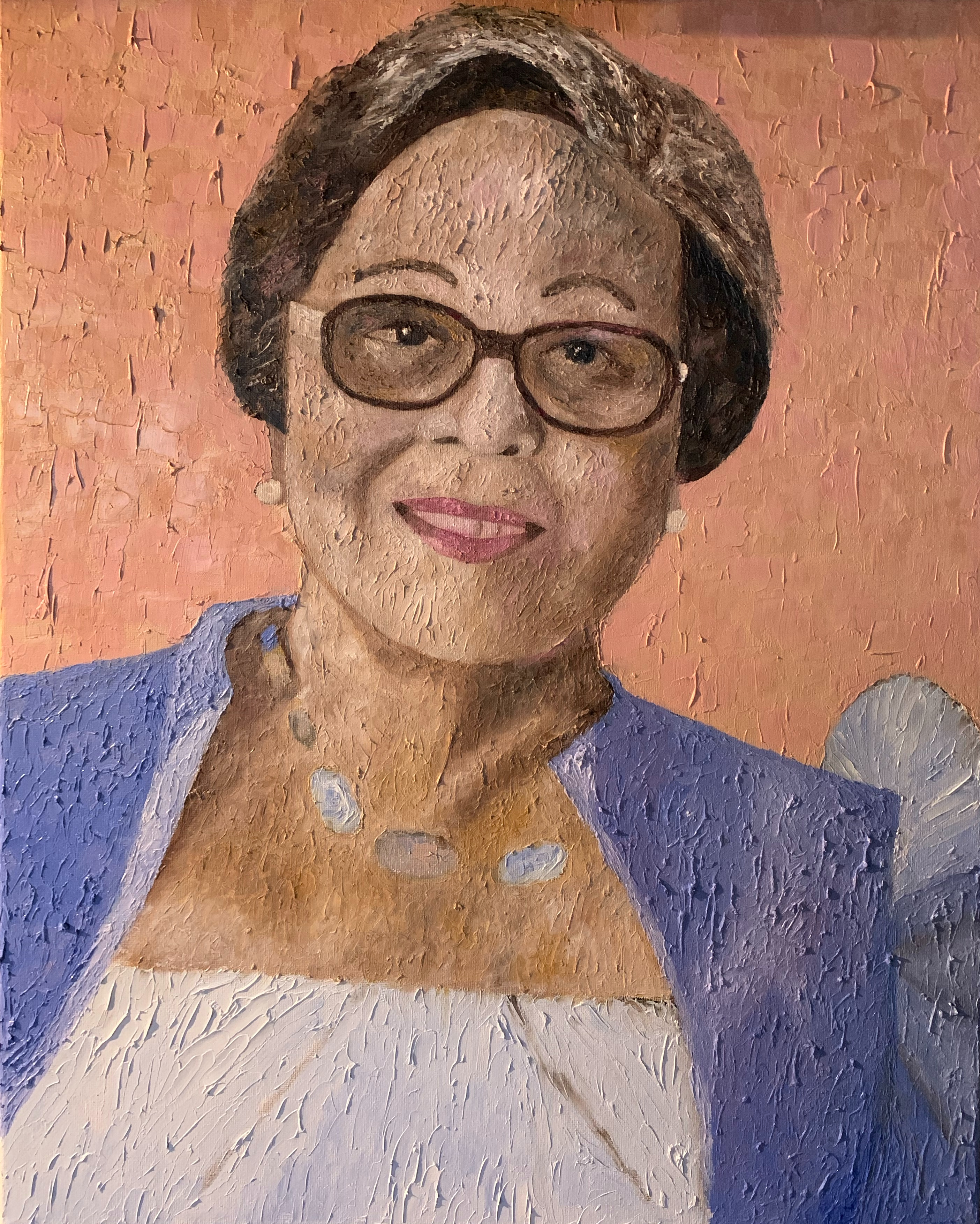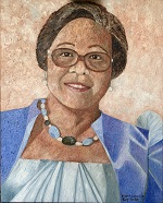 | The face is yellow, red, and blue to start with. The dress and background are complementary colors blue and orange, but I had to experiment to get the right tints of periwinkle and salmon. | The face is made more human using white and burnt umber on top of the base colors. I aim for some likeness by correcting the placements of the eyes, eyebrows, nose and mouth. | I add highlights and shadows on the face and dress. The dark areas under the glasses have to be convincing. |