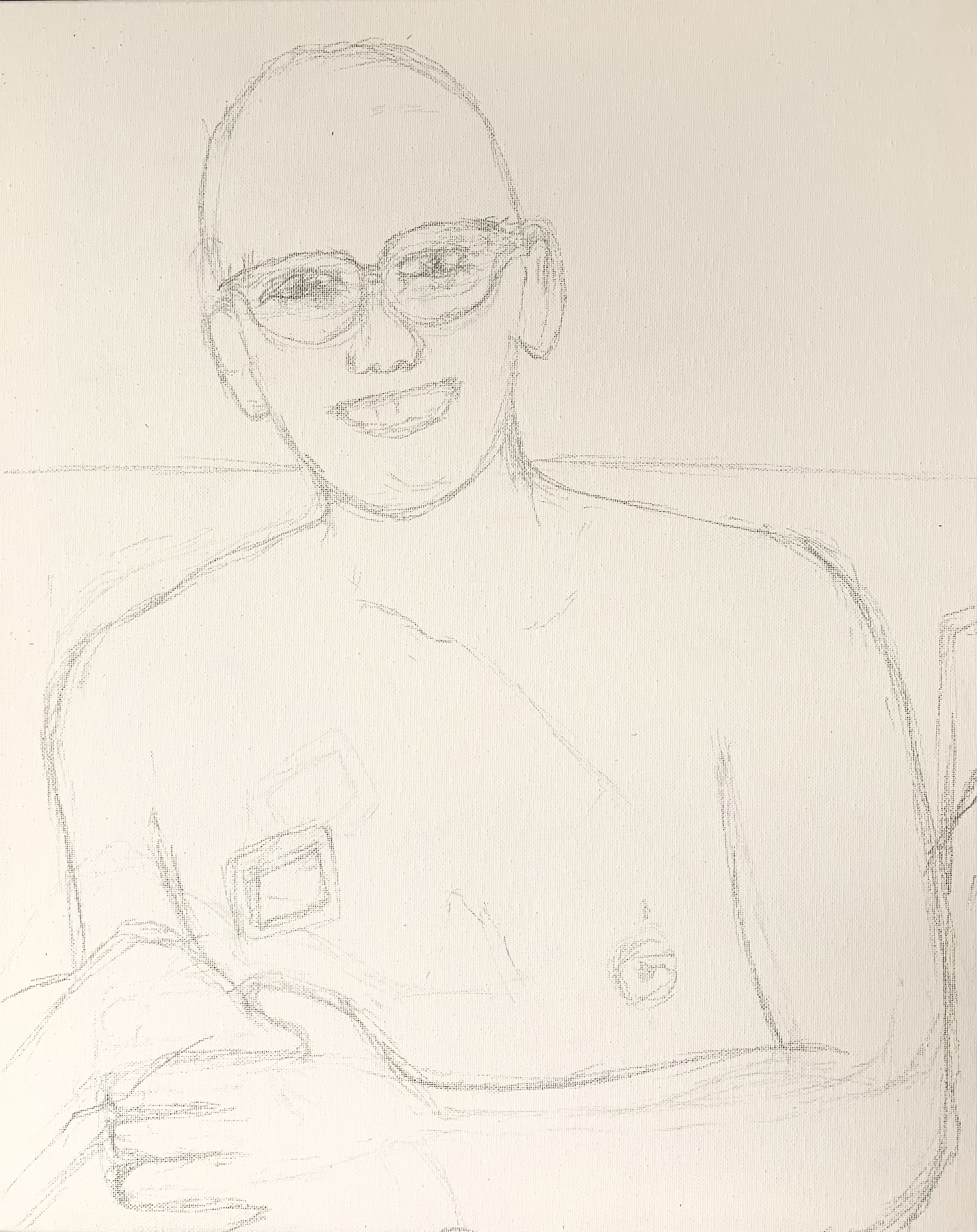 | This is the reference photograph. There are two small kids in the background but I decided to focus just on Simon. | The drawing is deceptively simple. | The outlines are redrawn using raw umber. The goal is to make sure the shapes are intact and ready for the next phase. |